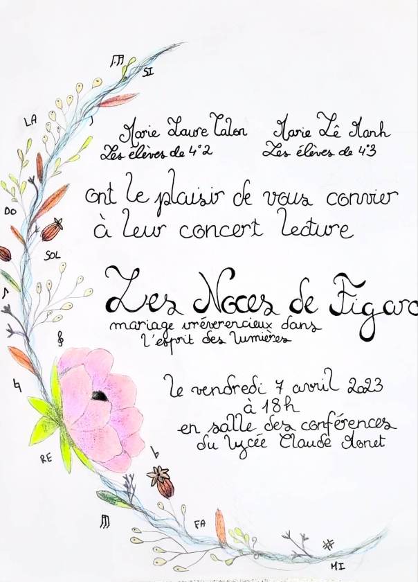 Pour notre traditionnel concert-lecture en 4e, Marie-Laure Talon, ma très chère collègue professeur de lettres avec qui j’ai un plaisir immense à travailler et moi-même, avions choisi pour thème Les Noces de Figaro. Ses élèves nous ont fait découvrir la beauté de la langue de la pièce de Beaumarchais tandis que les miens nous ont proposé une adaptation en français par leurs soins des plus grands airs de l’opéra de Mozart.